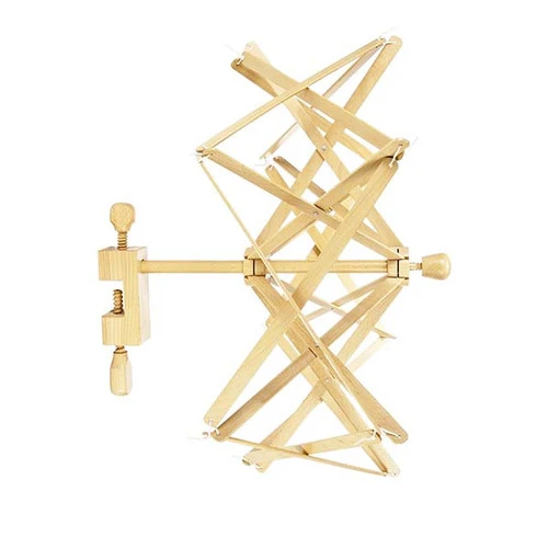Yarn swift designed for horizontal mounting, assuring that the skein remains in the center of the cage.