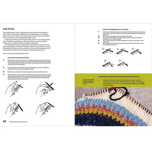 There are illustrated instructions for making socks, scarves and sweaters—but you’ll also find ideas for creating babysuits, scrunchies, T-shirts and even a prom dress. In addition to eschewing perfection, the Lærke Bagger technique involves tying knots instead of sewing the ends of yarn, recycling every inch of wool, and letting mistakes be a part of the design. With names like the Carpe Diem Sweater, the Bad Idea Top and the Easy Peasy Pillow, her knits are easily translated to fit whatever mood you’re in.