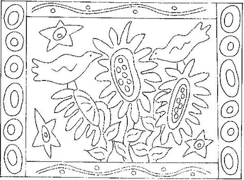 Two Crows and Sunflowers rug hooking pattern on Linen 28″ x 38″ by Melissa Elliot.
